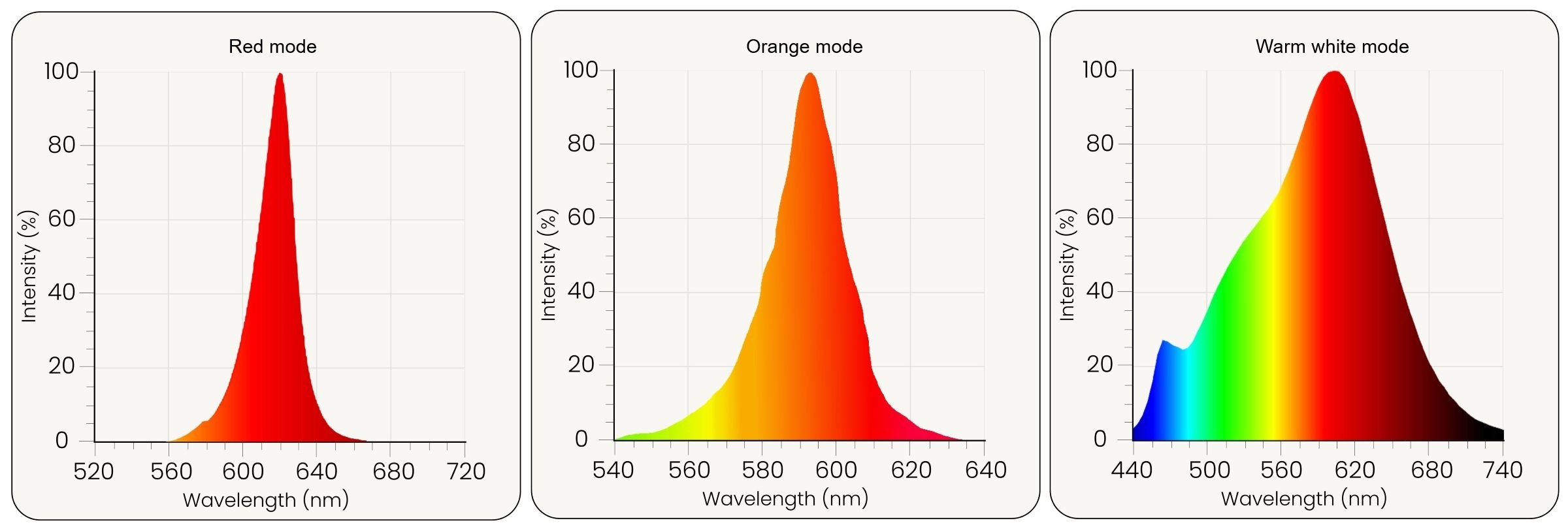 Graf znázorňuje, kolik světla žárovka vyzařuje na různých vlnových délkách při třech typech osvětlení – Red (červené světlo), Orange (oranžové světlo) a Warm White (teplé bílé světlo). Každý z těchto režimů má odlišné spektrum, které ovlivňuje nejen výslednou barvu světla, ale také jeho působení na lidský cirkadiánní rytmus, tedy biologické procesy spojené s bděním a spánkem.